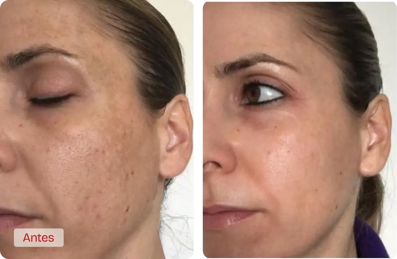"Mis manchas por el sol se han aclarado muchísimo. Mi piel luce más pareja y saludable. ¡No puedo creer el cambio!"
